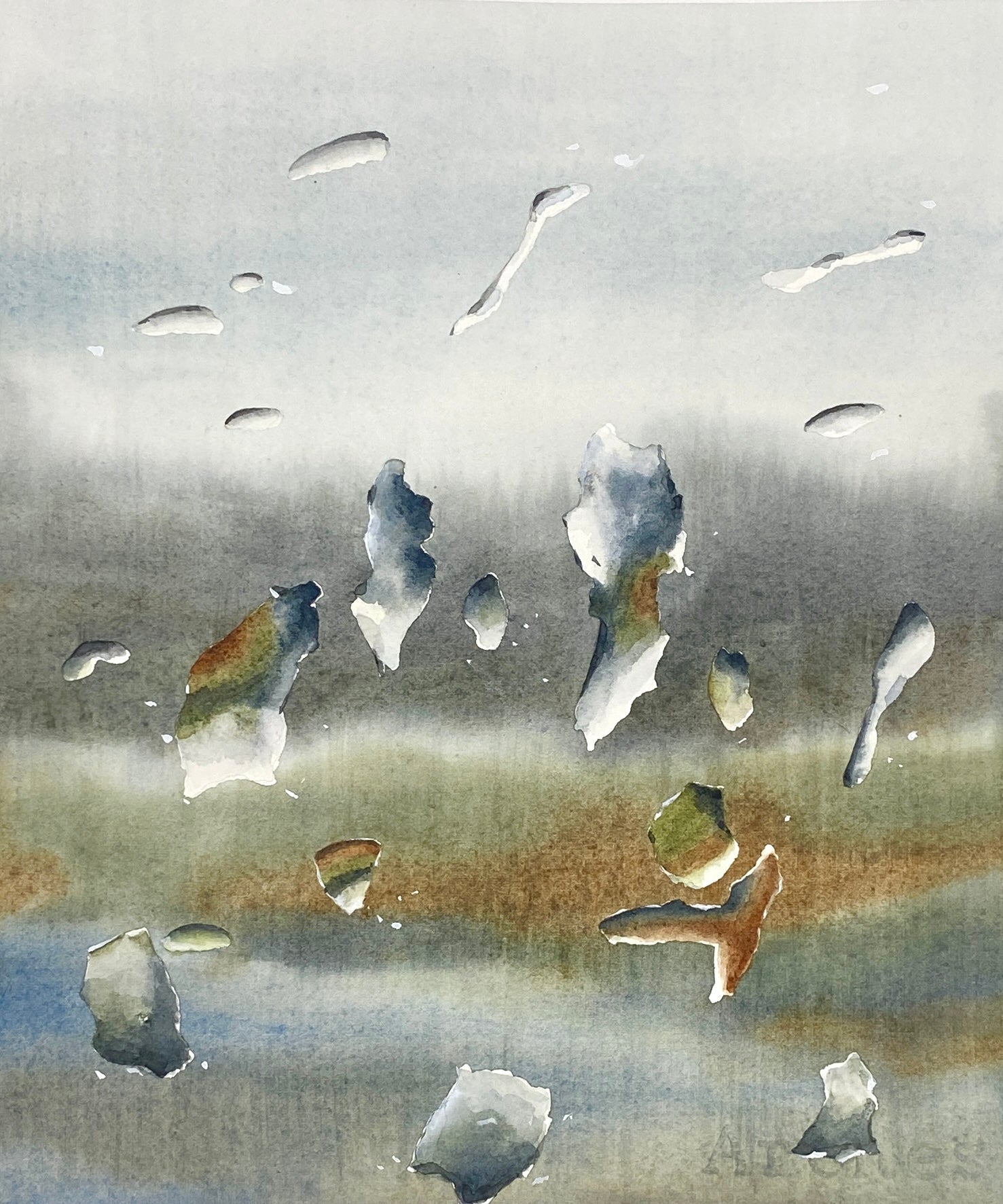 In watercolour, raindrops become more than fleeting marks and blur the viewer’s gaze, softening edges and obscuring clarity, as if nature itself were whispering secrets. This gentle distortion mirrors the hidden complexities of landcare: issues that lie beneath the surface, often overlooked until they ripple outward. Each translucent drop refracts light, revealing fragments of truth—erosion, habitat loss, fragile ecosystems—while maintaining an illusion of serenity. Through this interplay of concealment and revelation, the painting becomes a quiet protest, urging us to look closer, beyond the beauty, into the urgent care our landscapes demand.