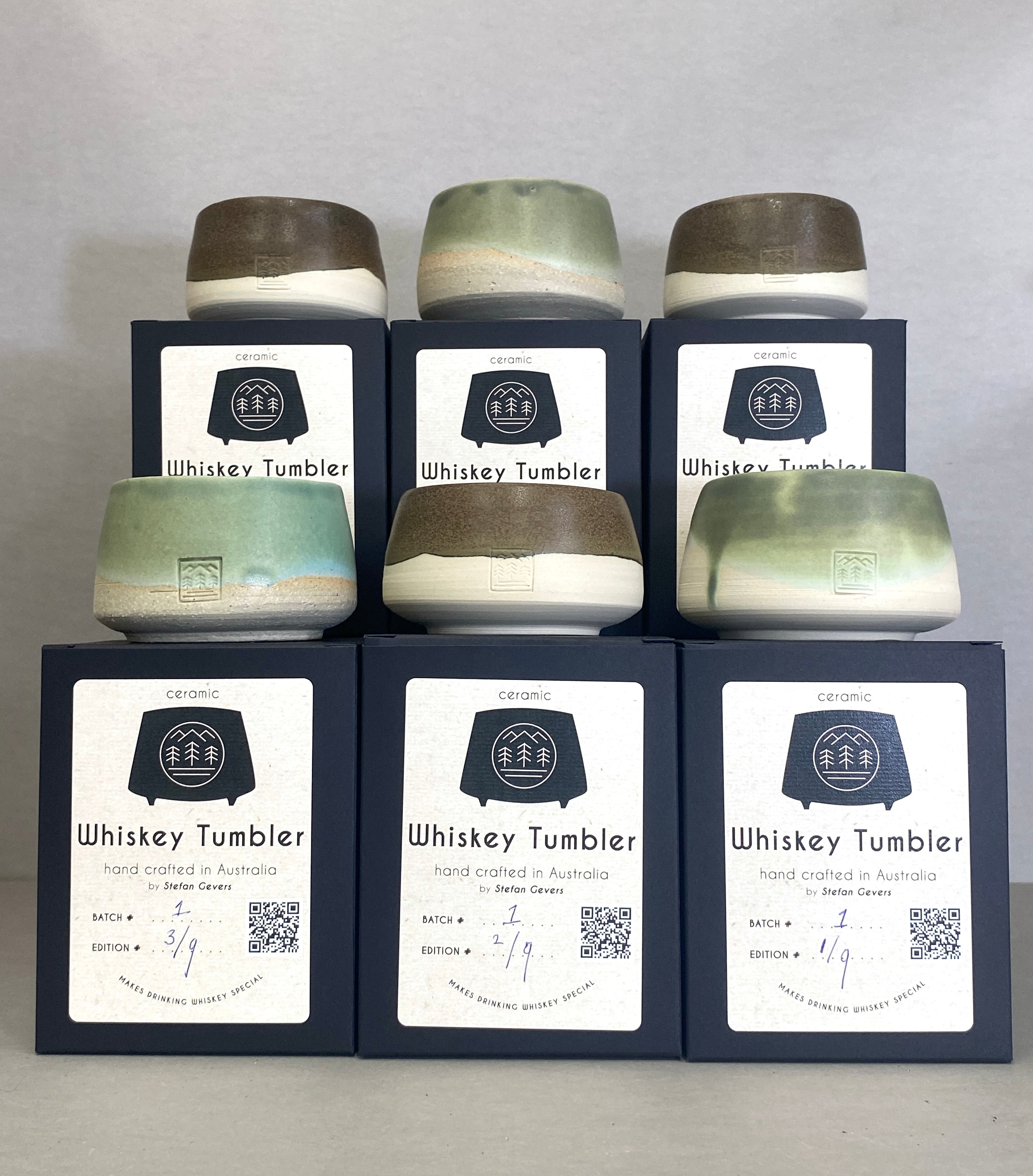 Limited edition handcrafted ceramic whiskey tumblers. Each piece, glazed and shaped by Stefan Gevers in Melbourne is made in small batches and numbered, making it a unique collector’s item. Perfect for whiskey enthusiasts and collectors.